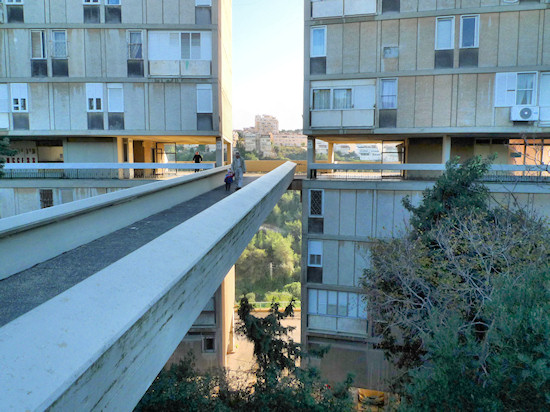 Cross Hanna Senesh St. and continue up. After 22 Hanna Senesh St., a path branches off up into an open area full of wild plants. Continue on this path to catch a wonderful view of Haifa Bay and the Galilee. This is the top of one of the hills that make up the Carmel range. It is worthwhile taking the time here to stroll around and enjoy the vegetation that is typical of the Mediterranean Carmel forest. Among the trees, note the Arbutus tree in its most northerly location. Continue on the path that starts to zigzag slightly, partly with steps, until Leon Blum St. Visible opposite are particularly huge buildings, but don’t panic - they represent an Israeli attempt to realize the modernist vision of architects, such as Le Corbusier, who developed the concept of the “machine for living” – complexes of apartments in a large building that offer a variety of services to the tenants. This Israeli version was designed by the architects Munio Gitai-Weinraub and Alfred (Al) Mansfeld at the end of the 1950s. They are also a representative example of construction on the Haifa Carmel ridge – the street level is located approximately at the mid-point of the building’s height and is accessible via a bridge. There are, of course, elevators in these buildings, but in the past buildings of seven floors were constructed without elevators: from the bridge, the residents would either go up or down three floors “only.”