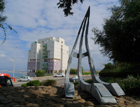 There are some notable buildings near the end of this section. At the traffic lights, cross Ha’asif St. and then Kish St. At 33 Kish St. opposite is a stone building that has seen better days: it was constructed in the 1950s as a hotel, became an events hall, and was finally abandoned. Walk around the building on the right on the pavement descending on Wingate Blvd. to reach a small garden containing a memorial to merchant navy sailors lost at sea whose place of burial is unknown.