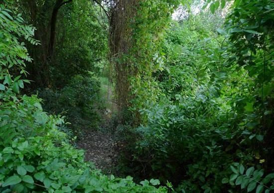 The remainder of the track is marked in blue and leads down the incline of the ravine. Here, the different character of the two slopes that define the ravine may be seen. The slope on the right faces south, it is more exposed to the sun and is characterized by sparse vegetation, while the left slope faces north, is shady and therefore has richer vegetation.