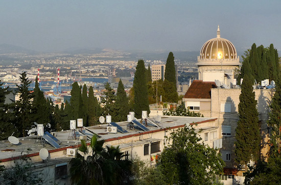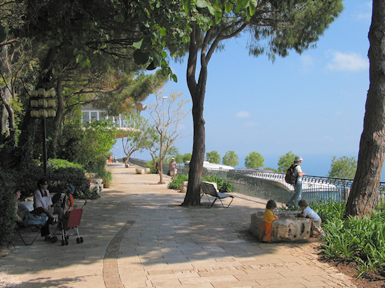 Continue on Hatishbi St. in an easterly direction and turn left into Iris St. that leads to HaNassi Blvd. Turn left and immediately cross and enter Dafna St., which leads back to Yefe Nof St. Turn right up the street where again a view north opens up; below is the manicured slope of the Baha’i Gardens.